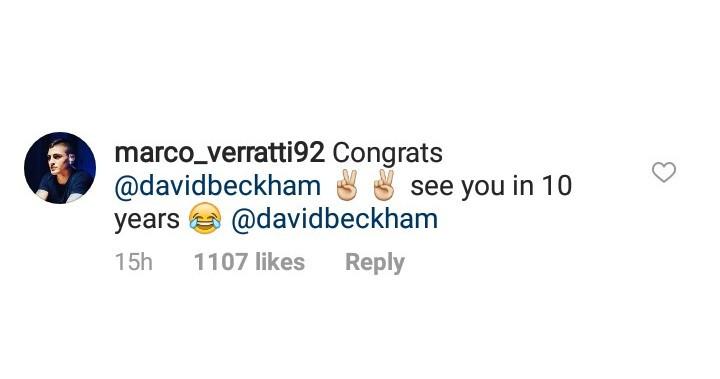 "Selamat kepada @davidbeckham. Sampai bertemu 10 tahun mendatang @davidbeckham," tulis Verratti mengomentari unggahan Beckham pada akun Instagram-nya.