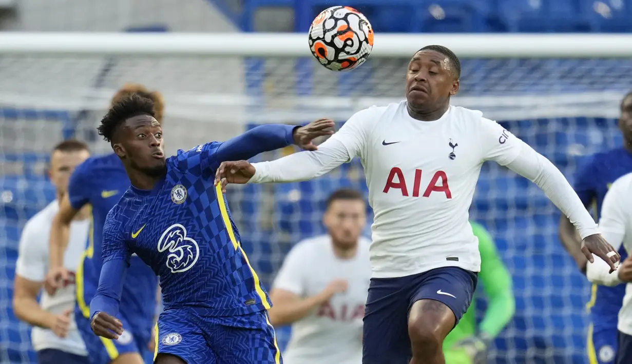 Gelandang Tottenham Hotspur, Steven Bergwijn (kanan) berebut bola dengan gelandang Chelsea, Callum-Hudson Odoi dalam laga uji coba pramusim 2021/2022 di Stamford Bridge, London, Rabu (4/8/2021). Tottenham bermain imbang 2-2 dengan Chelsea. (Foto: AP/Matt Dunham)